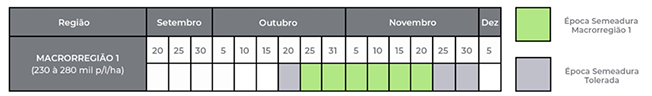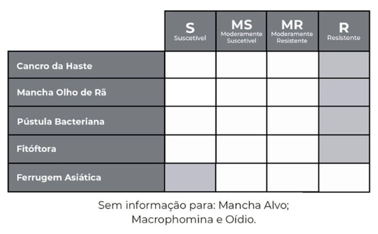 Porte: MÉDIO Hábito de Crescimento: INDETERMINADO Grupo de Maturação: 6.1 PMS: 156g Cor da Flor: ROXA Cor da Pubescência: CINZA Cor do Hilo: PRETO IMPERFEITO Exigência e Fertilidade: MÉDIA / ALTA