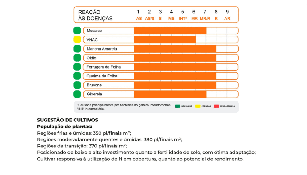Ciclo: PRECOCEEspigamento: PRECOCEMaturação: PRECOCEEstrutura da planta: BAIXAComportamento ao acabamento: MR/RComportamento à debulha: MRCrescimento (tolerância ao alumínio tóxico): MRPMS: 38 gramasGerminação na Espiga: MR