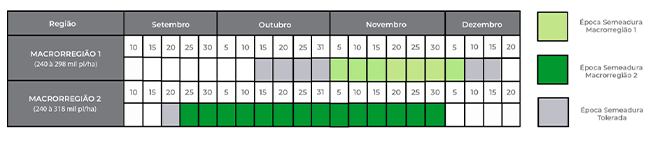 Porte: MÉDIO/ALTO Hábito de Crescimento: INDETERMINADO Grupo de Maturação: 6.1 PMS: 192g Cor da Flor: BRANCA Cor da Pubescência: CINZA Cor do Hilo: MARROM CLARO Exigência e Fertilidade: MÉDIA/ALTA
